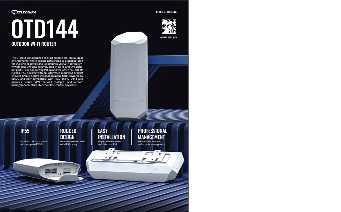 A Teltonika Networks új terméke, az OTD144 egy robusztus, kültéri használatra tervezett LTE router, amely stabil vezeték nélküli kapcsolatot biztosít akár távoli vagy ipari környezetben is. Két SIM-kártya foglalatának köszönhetően automatikusan képes hálózatot váltani, így folyamatos kapcsolódást garantál. A beépített Wi-Fi és a két Ethernet port – PoE-in és PoE-out támogatással – leegyszerűsíti a telepítést és az eszközök tápellátását. Az IP55 védettségű ház ellenáll az időjárási hatásoknak, míg a RutOS rendszer és az RMS távfelügyelet fejlett hálózatmenedzsmentet, VPN-t és biztonsági funkciókat kínál.